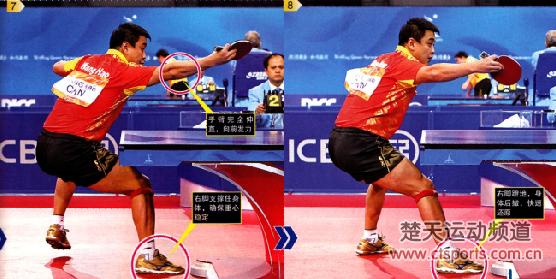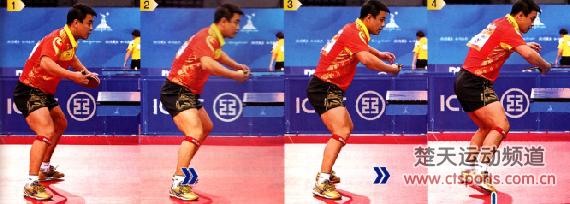 横拉台内球虽然是一种进攻手段,但对方回球的速度通常会比较快,这就对横拉后的还原提出了较高的要求。对直板选手来说,横拉后,如果对方快速压制自己的反手位,此时的压力最大,因为很难实现连续进攻。为了保证横拉之后还能占据上风,就必须快速后撤,准备好上旋球的相持。图8中,王皓横拉台内球后,右脚支撑住身体,并且发力蹬地后撤,同时他的上半身向前压,准备用反手连续相持。在业余选手中,能够掌握连续横拉技术的人比较少。