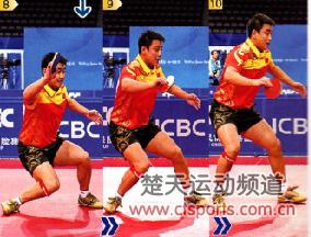 图4中,王皓向前跨出的步幅突然减小,这说明他意识到来球出现了变化,难以发力暴冲,于是他收住脚下的动作,同时压低右肩,右腿大幅度弯曲,右臂直接向下伸展,有一种“抄底”的感觉。