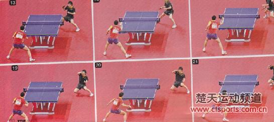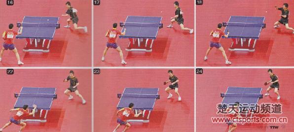 13)。马龙将球回防至松平反手位(图14至图1 5)。松平侧身发力暴冲直线得分(图1 6至图24)。