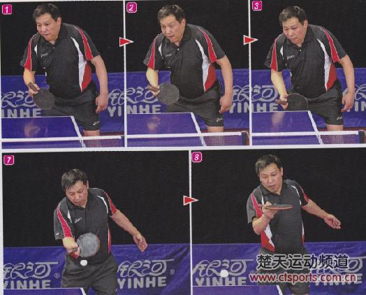 从图1-5中,我们可以看到潘强根据来球的方向使身体重心向左移动,逐渐转移到了左脚上。同时他的右肩稍稍下沉,通过转动手腕儿调整拍形,以保证抓住适当的击球时机。由于拍摄需要,潘强在接球前选择了一个比较合适的接球位置,而如果在实战中,一旦我们站位离台较近,对方在发球环节直接偷袭我们的底线长球时,大家