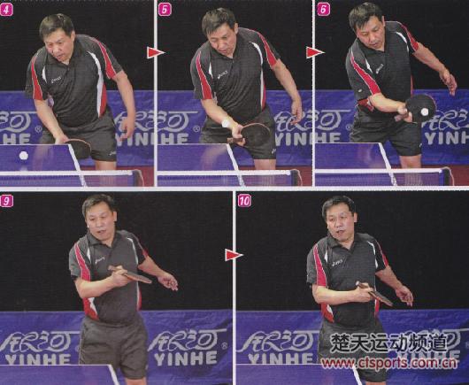 从图9-10中,我们可以看到潘强在击球后,重心也迅速放了下来。这种每板击球后的“还原意识”对下一板的衔接很有好处,也是大家在平时的实战中一定要强化的。一般来讲,直板长胶“撩”过去的球都带有上旋,对于反胶而言,一旦被对方防回来,我们要随即做好下一板连续进攻的准备。