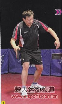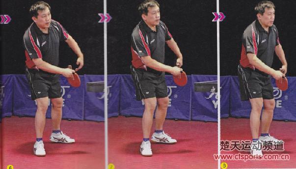 一t正手切”主要是当对方拉半出台的高吊弧圈球时使用,击球时一般赶在来球的下降初期,这样有利于我们依靠长胶胶皮的性能制造更强的旋转。从图1-3中,我们可以看到潘强的站位基本处于中近台位置,在准备击球前双腿微屈,右肩稍稍下沉。在引拍过程中,他主要是通过前臂稍稍抬起,而大臂则相对固定,与身体间距离也基本保持不变,这有利于在切球时保证动作的稳定性,也不至于因为手臂动作过大而错过最佳的击球点。