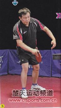 从图4中我们可以看到,潘强在击球时的拍形基本与地面形成垂直的角度,触球时主要是摩擦在了球的偏中部位置。在实战中,切球时的拍形是根据来球的旋转程度而定的。一般对于长胶来讲,对方拉过来的弧圈球越转,那我们的拍形就要保持得越立一些,这样才能达到克制对方旋转的效果。从图5中,我们可以看到潘强的前臂有一个往前下方送的动作,这说明他在击球瞬间顶住了来球,并且把爆发力集中作用到了球上。在这个过程中,我们还可以看到潘强的手腕儿一直保持得相对稳定,这是因为我们在击球瞬间要保证拍形的稳定,才能准确切到球的合理部位。而一旦我们的手腕儿出现晃动甚至是“甩”的情况,“切”的动作就会很难完成,从而会降低回球质量,这一点是大家要特别注意的。