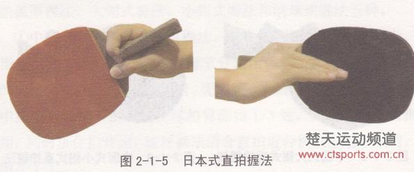 的软木垫便于食指扣住拍柄。其握法是,拇指紧贴拍柄左侧,食指扣住拍柄,形成一个小环状,紧握拍柄。中指和无名指基本伸直,小指自然地贴在无名指之下顶在球拍背面的1/3处。这种握拍法使手臂、手腕和球拍几乎连成一线,扩大了右半台的活动范围。其优点是正手拉弧圈球和扣杀能充分发力,缺点是手腕、手指较僵、不够灵活、处理快攻球、台内球、追身球和反手近台球比较困难,见图2 -1-5。