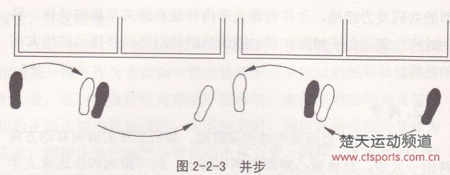 (1)方法。先以来球异方向的脚用力蹬地起动,先并一小步,同时另一脚向来球方向跨出一步。先起动的远侧脚,其移动幅度小于第二步,见图2-2-3。