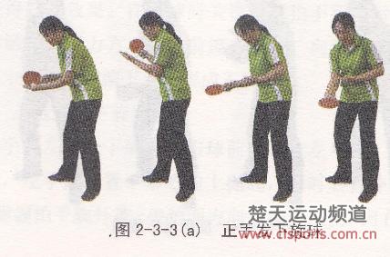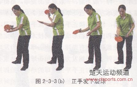 ①正手发下旋球。站位近台偏左角,左脚在前,右脚在后,左手持球置于掌心向上抛起,同时右臂外旋,直握拍手腕作伸(由手伸的肌群使手向手掌背方向运动伸展),横握拍手腕略向外伸展,向右后上方引拍。当球从高点下降至稍高于网或与网同高时,前臂加速向左前下方发力,同时手腕屈并内收,以球拍远端(拍头)触球,击球中下部向底部摩擦。击球后,手臂继续向左前下方随势挥动,见图2-3-3。
