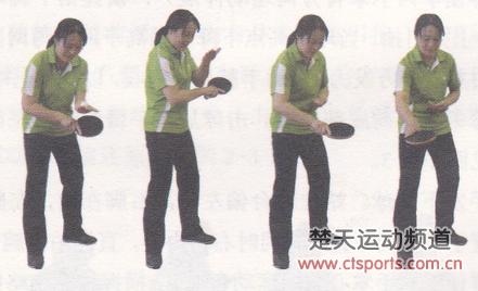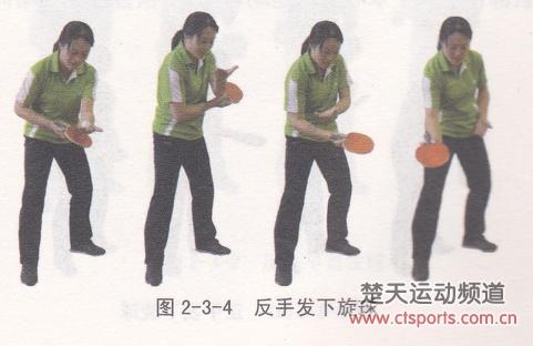 ②反手发下旋球。站位近台偏左角,右脚在前,左脚略后。左手持球置于掌心向上抛起,同时右臂内旋,直握拍手腕作屈(由手伸的肌群使手向手掌心方向运动弯曲),横握拍手腕略向外展,