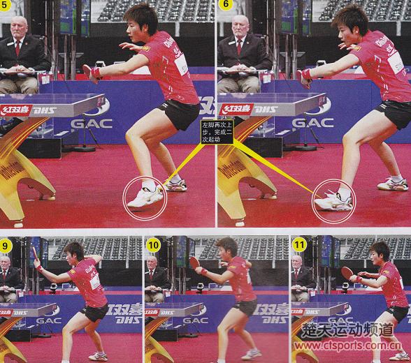 在2011年,丁宁能够收获世乒赛和世界杯两项大赛的女单桂冠,无疑得益于其日趋完善的技战术体系和比赛中的出色发挥。本篇我们就为大家介绍一组丁宁在接发球时运用“二次起动”的步法图解。