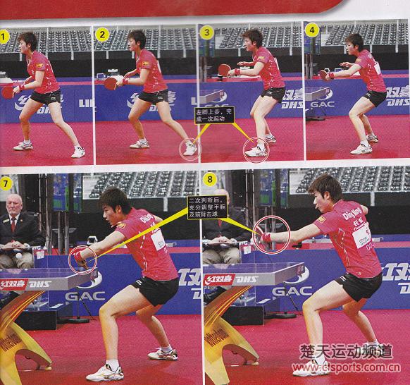 从图5-8中,我们可以看到了丁宁在进一步断出对方来球的落点后,左脚又向前上了一小步,完成了“二次起动”的过程。这也说明通过二次判断.运动员可以明确对方的发球离自己的身体是近还是远,然后果断地出手击球。