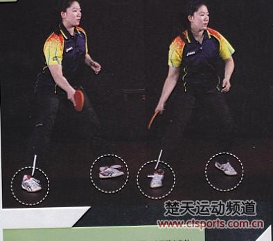 左脚蹬地后撤,起动并步的步法调整。右脚随之向斜后方撤步,以此调整到中台站位,处理对方弧线更长,力量更足的上旋球。在移动过程中,上半身的重心要保持前倾,不能后仰,这样有利于保证迎前击球,增强回球质量。下面小编用图片向大家展示出来: