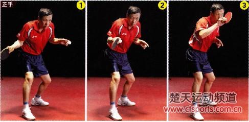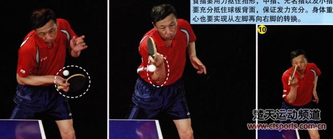 根据来球的具体情况,在向身体左后方转腰引拍的过程中要充分让开击球位置,并随之调整拍形,以能够压住出球弧线。击球时,可以肘部为轴,向右前方挥动前臂发力。同时,食指要用力抠住拍形,中指、无名指以及小指要充分抵住球板背面,保证发力充分。身体重心也要实现从左脚再向右脚的转换。
