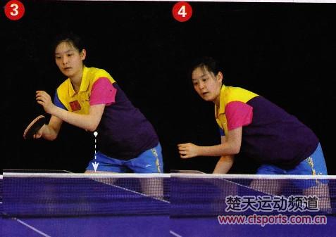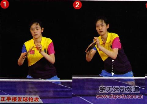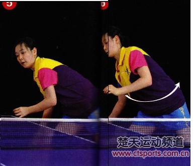 图1-2:重心降低,眼睛紧盯来球,当对手站侧身位发球时,己方站位也可偏左