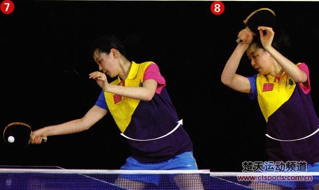 图7-8:击球后重心回到两脚之间,迅速还原准备下一板击球