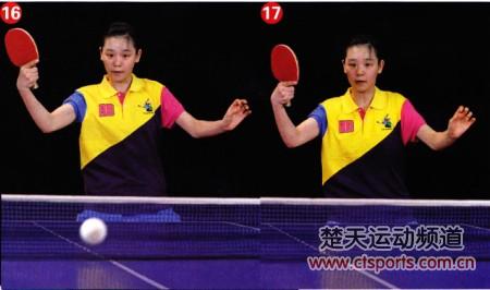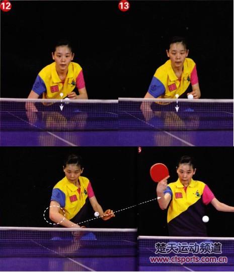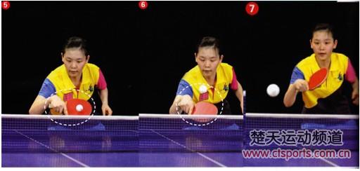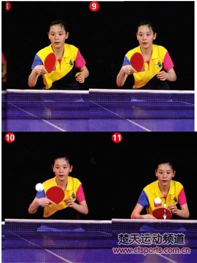 下图是曹紫涵用快搓加转回击对方发的强下旋短球,她将球搓至对方反手近网处,迫使对方按原路线搓回,然后迅速实施反手位抢拉。发力抢攻时可以中等力量拉打以求命中率,主要是注重落点上的变化,同时还应注意迅速还原防御自己的空当。