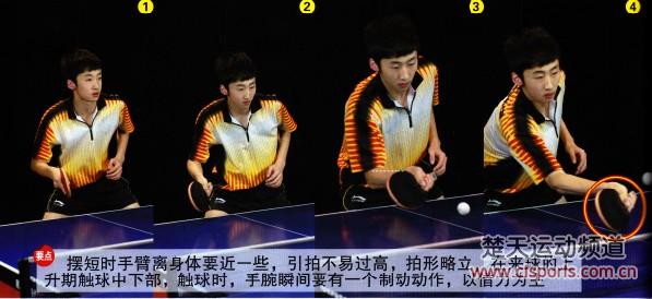 10月8日消息,摆短时手臂离身体要近一些,引拍不易过高,拍形略立,在来球的上升期触球中下部,触球时,手腕瞬间要有一个制动动作,以借力为主。