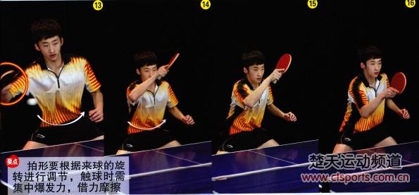 拍形要根据来球的旋转进行调节,触球时需集中爆发力,借力摩擦