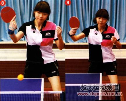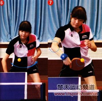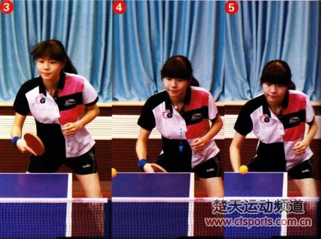 手腕稍内收,在来球的下降期击球。触球时,以腰带动前臂和手腕向上向前快速摩擦: