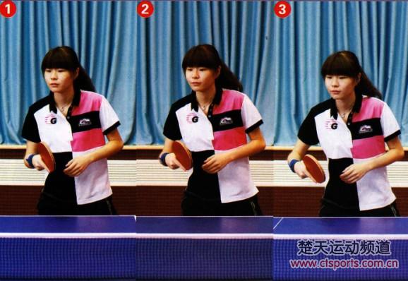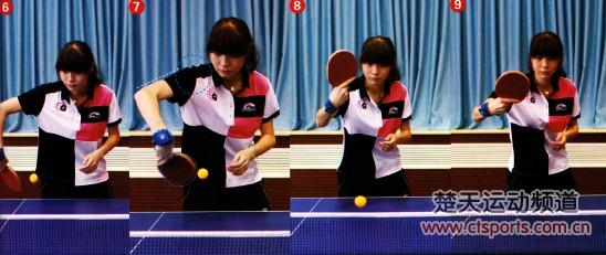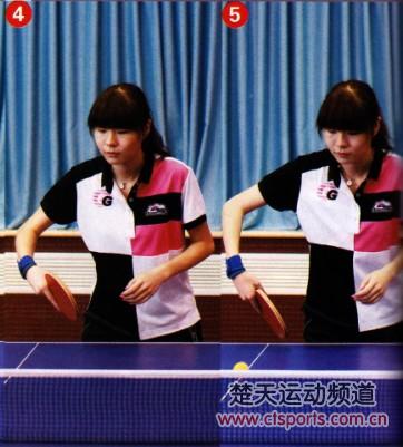 击球时,赶在来球的上升期或最高点,将拍形稍稍立起,摩擦球的中部偏上位置。本篇示范队员的手腕