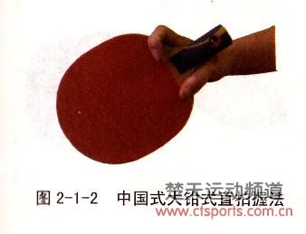 握得比较稳,能有效地利用上臂和前臂集中发力,但由于握拍较深,影响手指、手腕施力的灵活性,不利处理台内球、加转下旋球、追身球和推挡球,见图2-1-2。