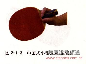 中国传统的两面攻选手和一面长胶另一面反胶的“倒拍”打法选手比较多见采用。即拍前,拇指和食指间距离较小,握拍较浅。其优点是手指、手腕施力比较灵活,但不利于发力。由于握拍稳定性略差,不易高压击球,尤其正手回接弧圈球比较困难,见图2-1-3。