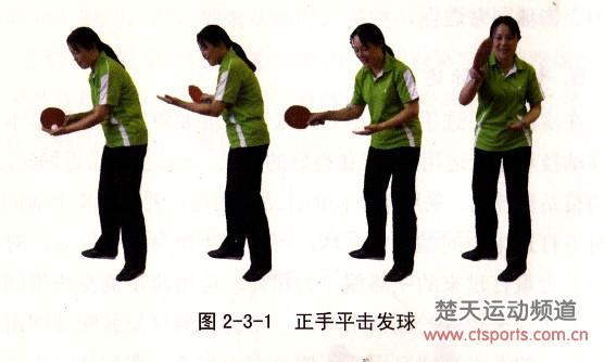 正手平击发球。站位近台,左脚稍前,右脚略后,含胸收腹。左手持球置于掌心向上抛起,同时右臂内旋,使拍而稍前倾,手臂向右后方引拍。当球从高点下降至稍高高于网球时,击球中上部向左前方发力,击球后第一落点在球台中央,击球后手臂继续向左前方挥动并迅速还原成准备姿势,见图2-3-1。