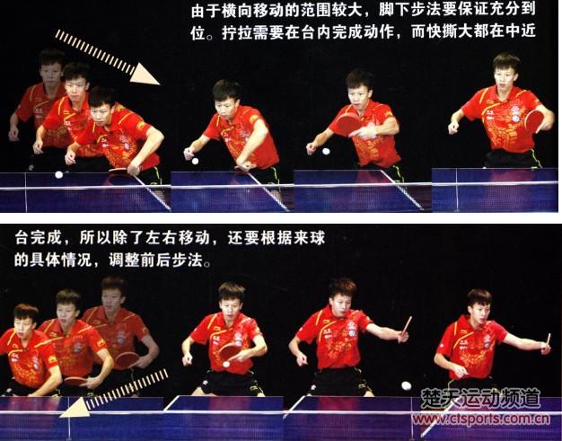 由于横向移动的范围较大,脚下步法要保证充分到位。拧拉需要在台内完成动作,而快撕大都在中近台完成,所以除了左右移动,还要根据来球的具体情况,调整前后步法。