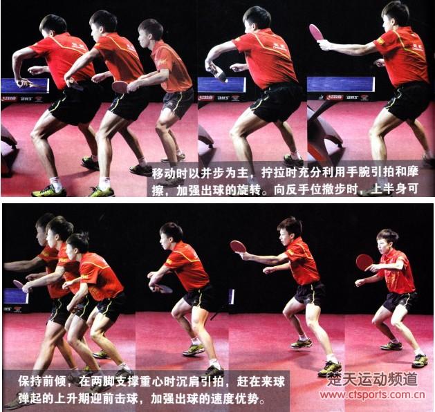 移动时以并步为主,拧拉时充分利用手腕引拍和摩擦,加强出球的旋转。向反手位撤步时,上半身可保持前倾,在两脚支撑重心时沉肩引拍,赶在来球弹起的上升期迎前击球,加强出球的速度优势。