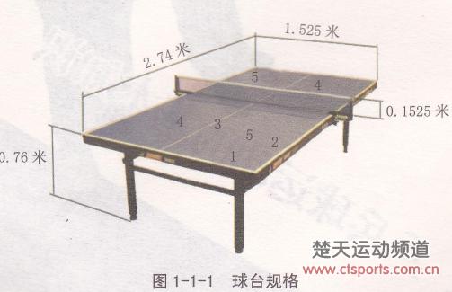 球台的上层表面叫做比赛台面,长2. 74米,宽1.525米,离地面高0. 76米,见图卜卜l。沿每个2.74米的台面边缘各有一条2厘米宽的白色边线,沿每个1. 525米的台面边缘各有一条2厘米宽的白色端线。球台由一条3毫米宽的白色中线划分为两个相等的“半区”。中线与边线平行,并应视为右半区的一部分。