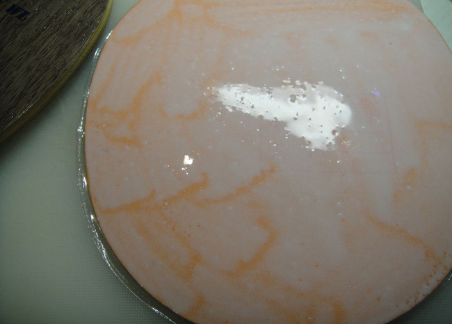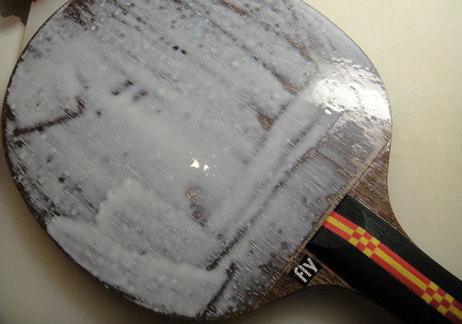 底板胶皮完全干了之后就可以粘合了,粘合后底板套胶还是比较紧密的,相比其他无机胶水据说海夫还有打底功能,反正有更好,没有也无所谓啦,粘住胶皮的目的是达到了,如果在粘合过程中一旦发现有空气被封在底板和胶皮之间,一定不要强行挤出,因为无机胶水一体性很强,很容易直接把底板上的胶层全部挤开,只需放置几个小时,鼓泡自己就会下去了,压实了一样可以打。