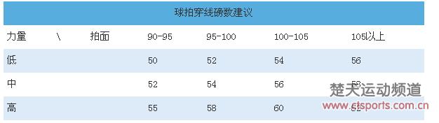 如果你无法把握合适你的穿线磅数,第一次可以参照穿线师的建议,之后根据此次使用情况进行调整。而从我们穿线师的经验来看,以下的穿线磅数是比较建议的: