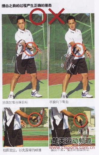 拍面必须朝向目标,而且在撞击的瞬间尽可能保持稳定。拍面如果不固定,撞击时就会晃动,击球方向也就无法固定。因此,撞击的瞬间要固定握拍,而在撞击之前手腕要保持放松。