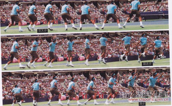 与击球相比,我并不认为步法的变化要少一些。我们向外踏出的第一步就至少有三种变化(后撤步、旋转步、上步)。而步幅和角度也会因此产生多种变化。同时,我们既会用到“渭步”,也会用到“交叉步”,还会在跑动中用到大步幅。不同的站位也会影响到步法的变化。其后,我们还要用到“跟进步”——裉据情况,需要将后脚前移,并且要抓住合适的时机。回防需要用到“交叉步”及“滑步”。
