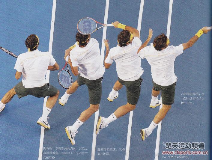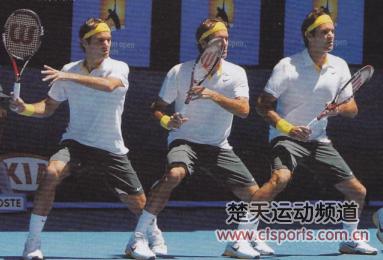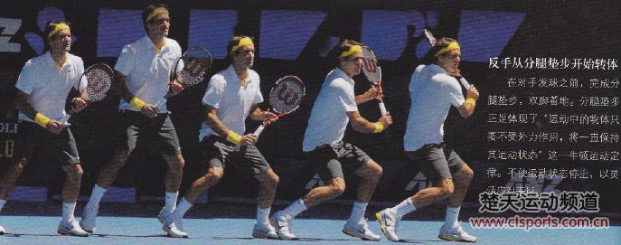 费德勒的接发球技术--反手从分腿垫步开始转体在对手发球之前,完成分腿垫步,双脚着地。分腿垫步正是体现了“运动中的物体只要不受外力作用,将一直保持其运动状态”这一牛顿运动定律。不是运动状态停止,以灵活应对来求!