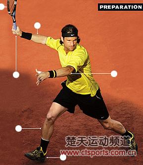 球拍:莫亚引拍时球拍的高度高于他的头。这样的球拍高度可以为击球带来大量的拍头速度。
