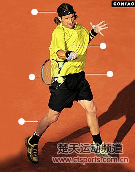 击球分解 头部:这时,莫亚的脸部很放松而且面无表情。如果击球时,你的头乱动会影响你的平衡。 球拍:这时球拍已经在球的上方,很显然,莫亚是从下往上“刷”球,带来很大的上旋。 右腿:即使莫亚用开放式步法,仍给他的击球带来了巨大的前冲力。第一张图中我们看到,他把身体的所有重量都放在了右脚上,现在他的右脚几乎离开了地面,他把右腿的大部分力量都用在了刚才的那一击上(现在他的右脚指向了前面)。