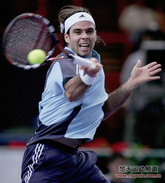 这时,你看不到他有任何的退却,接下来的二发,反到是比他领先时更敢发力、落点也更接近发球线了。这是冈萨雷斯应对压力的办法,对他确实也很有效。
