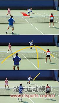 接发后的第二拍该怎么打?告诉你三种方法,你可以去球场上对它们的效果一探究竟。但要说明的是,回球线路是要根据场上局面的不同随机应变的。一对优秀的双打选手知道怎样通力合作,互相取长补短,这里总结出的三种方法只是多种变化的最原始形态或者说是基础。