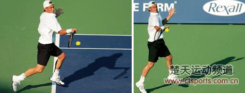 下图:从这两张照片可以看出,虽然球的落点不同,选择击球的前后点也不同,但休伊特的挥拍速度却保持了良好的稳定。这主要得益于他良好、快捷的步伐调整。