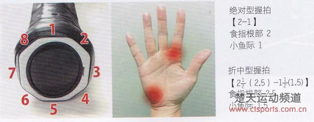 除这种握拍方法之外,大部分球员会采用折中一些的握拍方式。即食指根部放在2丢(2.5),小鱼际放在12( 1.5)的位置。关于握拍方式,即使是在高速摄像机的镜头下,仍难一窥究竟,希望我们这里所做的文字说明能够起到辅助说明的作用。