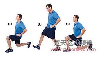 网球准备运动——弓步走动作(针对臀部、小腿、腿关节、四头肌)