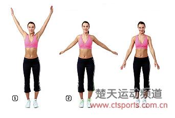 两臂向上举,然后向后划圆,绕回前面,回到开始的地方。这样划10次圈,然后反方向再划10次。