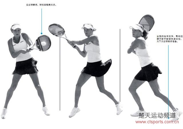 2 这个侧身准备的姿势,对于开放式双手反拍击球来说非常理想。在拉德万斯卡的左脚站稳之前,她的头和双肩完美的排列在髋部和双脚之上。所有这些身体部位都是同时工作的。她依靠双肩的转动和双臂一起将球拍向后拉开,双脚建立坚实的根基,以便将身体的力量运用到击球中。一但左脚接触场地,她的髋关节和双肩将开始回转,身体重心也将开始向前转移。