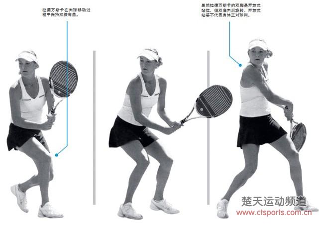 1 当对手打出的球飞过来时,A·拉德万斯卡用小碎步向左边移动,同时开始将球拍向后拉开,为即将进行的开放式双手反拍做准备工作。注意拉德万斯卡双膝弯曲的动作,这样做可以使她平稳的接近来球。她的双手放在身前非常舒服的位置,双臂保持放松。