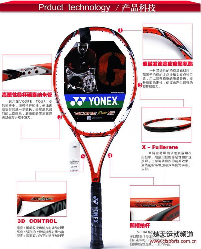 这一款球拍继承了VCORE系列的强力旋转性能外,尤尼克斯VCORE TOUR G网球拍最大的亮点,是搭载了高塑性叠杯碳素纳米管技术,有效调整拍杆韧性,延长驻留时间,增强控球手感,全面提升球拍对击球落点的控制力。配合3D CONTROL立体化控球科技,通过对击球旋转量的把握,发挥制胜旋转。超微发泡高密度聚氨酯带来出色的吸震性能和击球手感,创造出令人吃惊的击球威力。
