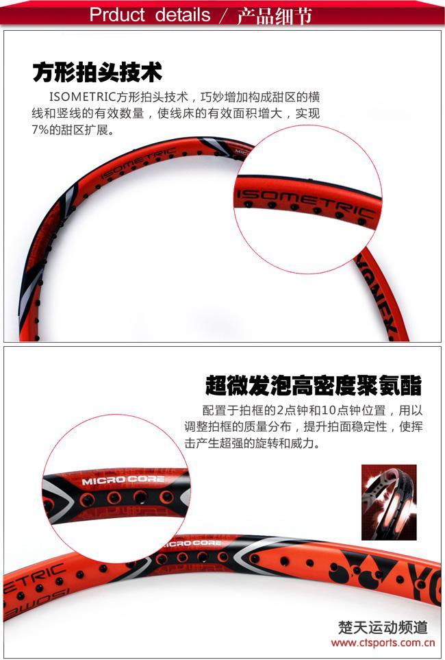高塑性叠杯碳素纳米管的运用增强拍杆韧性,使线床驻留时间进一步延长,造就更高层次的击球旋转度,配合YONEX独创的方形拍头设计,发挥制胜的旋转,充分掌控球场空间击败对手。这款进攻型并追求旋转和速度感的球拍,是高级球手在比赛场上不断取胜的有力武器。