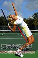 有了良好的抛球和曲膝动作后,最容易犯的错误是挥拍时低头弯腰。看上去你的身体就好像从腰部被折了起来。这样很难增加球速和旋转。你必须向上伸展身体,这样才能用上全力增加发球威力。使背部完全伸直并且开始回转上身的关键是身体有向上的意识。