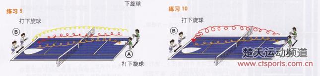 这一练习可根据不同阶段,从喂球练习过渡到两人对练。练习目的是在不改变目标的前提下使击球产生变化(调整)。通过练习可加强对球飞行时间、反弹后的飞行时间及旋转量变化的控制能力。