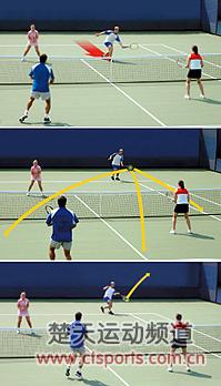 如果对手发球后选择留在底线(特别是二发偏软的时候),这是重炮回球顺势随球上网截击的有利机会。假如对手发球后也选择了上网,由于你早有准备,你的封网也会显得得心应手许多——截击,对手到位前让球在楚河汉界的另一边生根。这是因为,由于你早有准备,第一截击在发球线附近完成,所以击球能更有把握,至少保证球过网很低迫使对手上网。