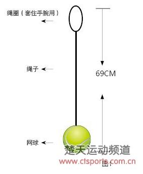 将绳圈套入执拍手手腕,拇指食指中指捏着绳索。以辅助练习器当作球拍做连续发球动作,练习时不必发力。