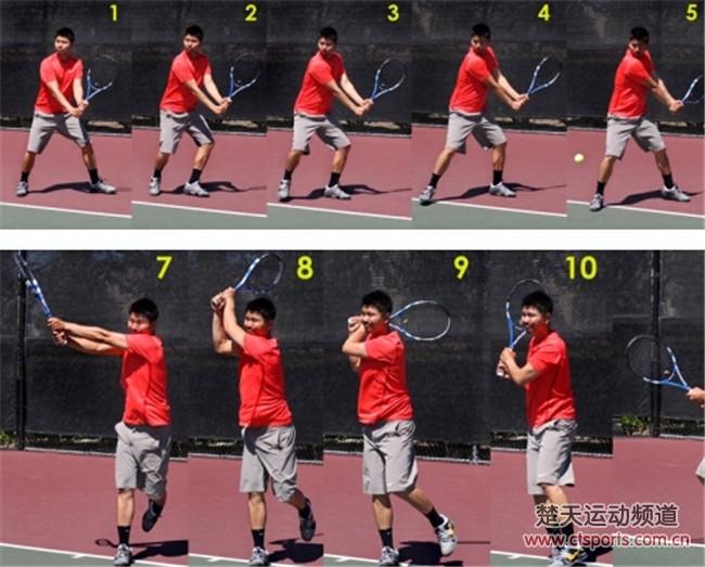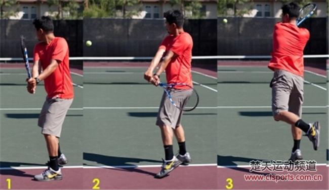 臀部和肩膀转动:身体与网保持一致;击球点直着通过前面的脚。